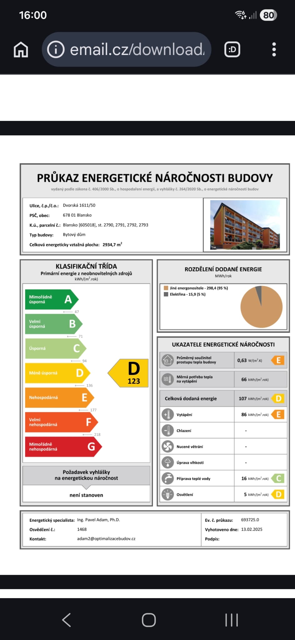| Ukazatel ENB | 123 kWh/m2 za rok |